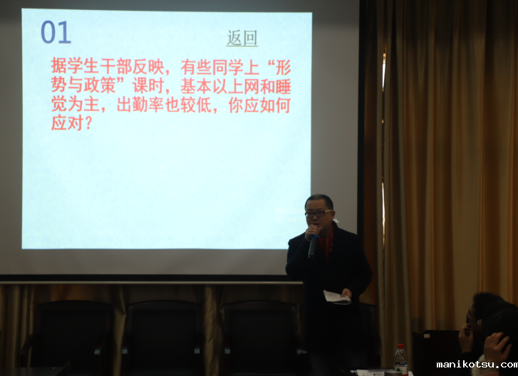 大赛共分为四个环节。12月17日下午,全体辅导员在一教学楼101教室参加了理论考试,理论考试的内容包括由基础知识和网文写作两部分。通过二级学院推荐和学生工作部抽签两种方式产生的18名辅导员参加了案例分析、谈心谈话、理论宣讲三个环节的竞赛。案例分析环节,参赛辅导员围绕学生日常管理和思想政治教育实际工作中有可能遇到的形形色色的案例,从问题本质、解决思路、实施办法及相关启示进行了精彩阐述。在谈心谈话环节, 参赛辅导员围绕学生管理案例, 分别扮演辅导员和学生的角色,以情景再现的方式开展谈心谈话。参赛选手熟悉运用政策、理论与科学方法,迅速寻找谈话关键点,理论联系实际,过程鲜活生动,博得现场观众阵阵掌声。在理论宣讲环节,参赛辅导员围绕抽到的“初心与使命与”、“从严治党永远在路上”、“文化自信”等主题为现场观众带来了一场内容丰富、深入浅出的思想理论宣讲。