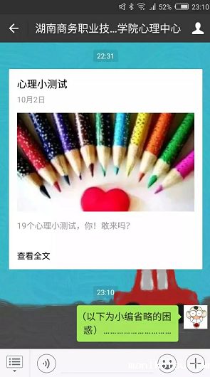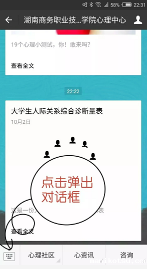 关注韦德com心理中心微信公众号,进入公众号,如下图操作并发送: