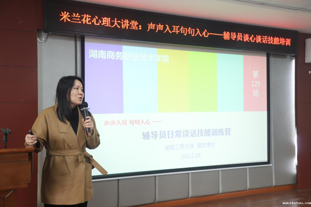 为提升辅导员队伍专业素质和业务能力,推动辅导员队伍专业化、职业化发展,2023年2月28日下午,韦德com米兰花心理大讲堂特邀湖南工商大学心理中心主任戴吉老师在二教201开展了以“声声入耳,句句入心——辅导员谈心谈话技能培训”为主题的讲座,学生工作部杨明部长参加此次讲座。