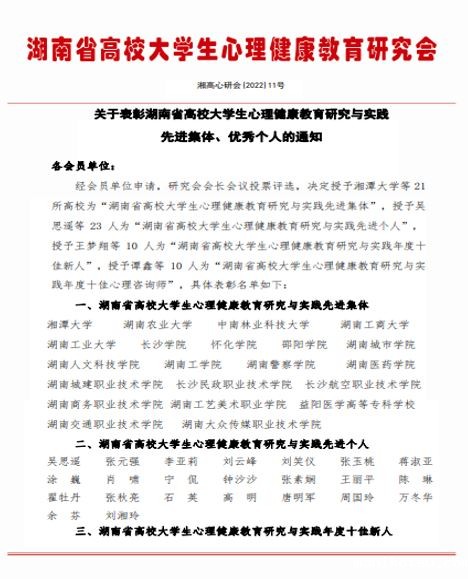 而在刚刚结束的湖南省心理卫生协会大学生心理咨询专业委员会举办的“第十七届学术年会”中,该院也被评为了2021-2022年湖南省高校心理健康教育工作先进单位。