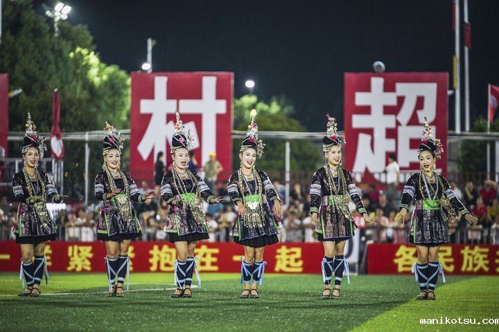 2024年9月28日,榕江县侗族大歌队的演员们在“村超”足球场上表演。当日,“发现中国之美·相约贵州村超”国际友谊赛在贵州省黔东南苗族侗族自治州榕江县的“村超”足球场举行。(新华社记者 陶亮/摄)