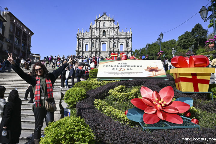 “莲花宝地”的城市风景,充溢着节日的气息:耸入云端的澳门旅游塔,披上了红色的灯影;大三巴牌坊矗立,如织的人群在庆祝海报前流连……