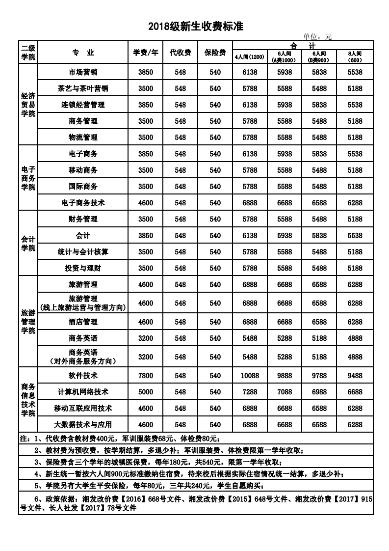 学院2018级新生收费标准